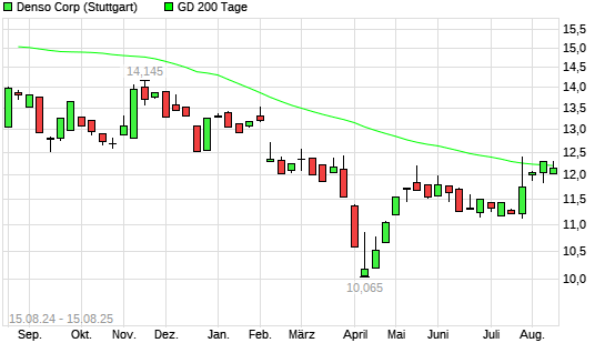 Mit dem Rücksetzer auf 12,10 EUR hat die Denso-Aktie am 14.08.2025 die 200-Tage-Linie nach unten gekreuzt.
