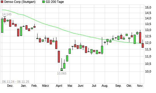 Mit dem Rücksetzer auf 11,76 EUR hat die Denso-Aktie am 05.11.2025 die 200-Tage-Linie nach unten gekreuzt.