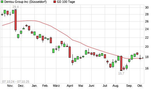Mit dem Anstieg auf 17,90 EUR hat die Dentsu-Aktie am 06.10.2025 die 100-Tage-Linie nach oben gekreuzt.