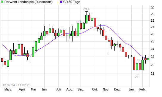 Mit dem Anstieg auf 23,40 EUR hat die Derwent London-Aktie am 10.02.2025 die 50-Tage-Linie nach oben gekreuzt.