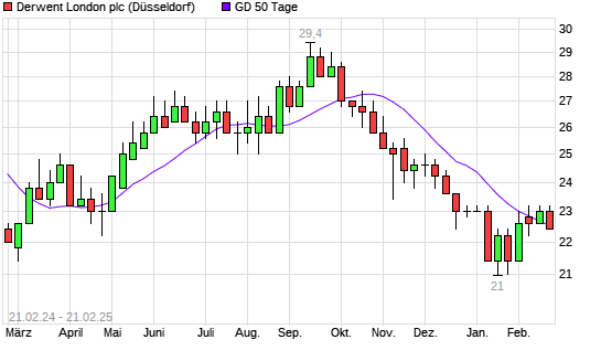 Mit dem Anstieg auf 23,00 EUR hat die Derwent London-Aktie am 20.02.2025 die 50-Tage-Linie nach oben gekreuzt.