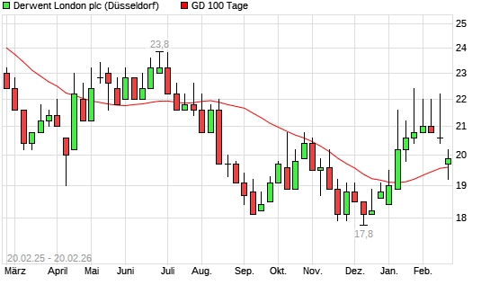 Mit dem Rücksetzer auf 20,00 EUR hat die Derwent London-Aktie am 19.02.2026 die 100-Tage-Linie nach unten gekreuzt.