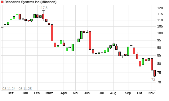 Mit dem Rücksetzer auf 72,55 EUR hat die Descartes Systems-Aktie (ISIN CA2499061083) am 07.11.2025 ein neues 12-Monats-Tief erreicht und damit den Kurs vom 05.11.2025 eingestellt.