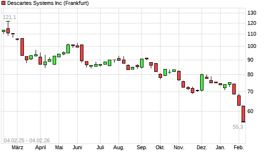Mit dem Rücksetzer auf 61,00 EUR hat die Descartes Systems-Aktie (ISIN CA2499061083) am 03.02.2026 ein neues 3-Jahres-Tief erreicht und damit den Kurs vom 02.02.2026 eingestellt.