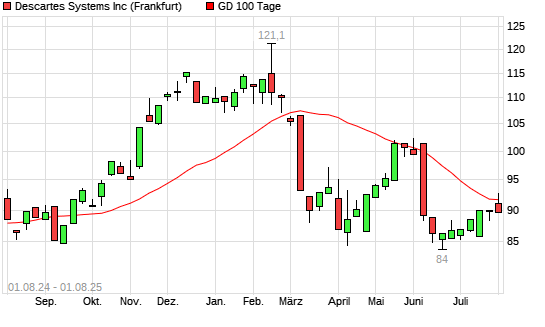 Mit dem Anstieg auf 92,75 EUR hat die Descartes Systems-Aktie am 31.07.2025 die 100-Tage-Linie nach oben gekreuzt.