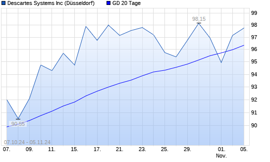 Mit dem Anstieg auf 96,95 EUR hat die Descartes Systems-Aktie am 04.11.2024 die 20-Tage-Linie nach oben gekreuzt.