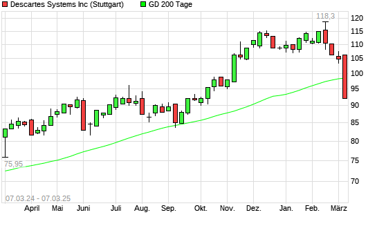 Mit dem Rücksetzer auf 94,35 EUR hat die Descartes Systems-Aktie am 06.03.2025 die 200-Tage-Linie nach unten gekreuzt.