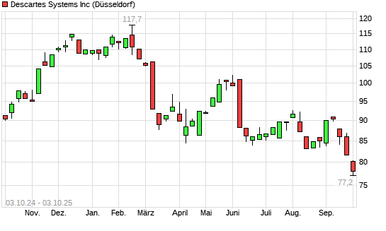 Mit dem Rücksetzer auf 77,45 EUR hat die Descartes Systems-Aktie (ISIN CA2499061083) am 02.10.2025 ein neues 12-Monats-Tief erreicht und damit den Kurs vom 01.10.2025 eingestellt.Die Descartes ...weiterlesen