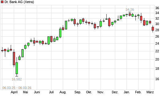 Mit dem Rücksetzer auf 27,94 EUR hat die Deutsche Bank-Aktie (ISIN DE0005140008) am 05.03.2026 ein neues 6-Monats-Tief erreicht und damit den Kurs vom 03.03.2026 eingestellt.