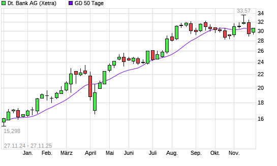 Mit dem Anstieg auf 30,57 EUR hat die Deutsche Bank-Aktie am 26.11.2025 die 50-Tage-Linie nach oben gekreuzt.