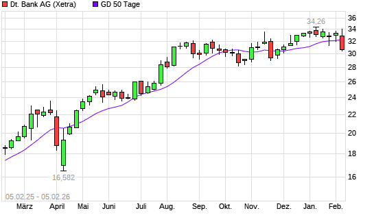 Mit dem Rücksetzer auf 32,12 EUR hat die Deutsche Bank-Aktie am 04.02.2026 die 50-Tage-Linie nach unten gekreuzt.