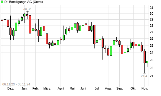 Mit dem Rücksetzer auf 22,35 EUR hat die Deutsche Beteiligungs-Aktie (ISIN DE000A1TNUT7) am 04.11.2024 ein neues 12-Monats-Tief erreicht und damit den Kurs vom 31.10.2024 eingestellt.