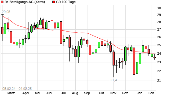 Mit dem Rücksetzer auf 23,50 EUR hat die Deutsche Beteiligungs-Aktie am 03.02.2025 die 100-Tage-Linie nach unten gekreuzt.