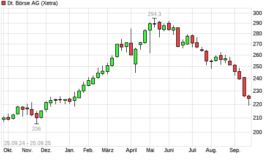 Mit dem Rücksetzer auf 220,60 EUR hat die Deutsche Börse-Aktie (ISIN DE0005810055) am 24.09.2025 ein neues 6-Monats-Tief erreicht und damit den Kurs vom 23.09.2025 eingestellt.