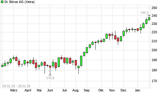 Mit dem Anstieg auf 239,20 EUR hat die Deutsche Börse-Aktie (ISIN DE0005810055) am 28.01.2025 ein neues All-Time-High erreicht und damit den Kurs vom 27.01.2025 eingestellt.
