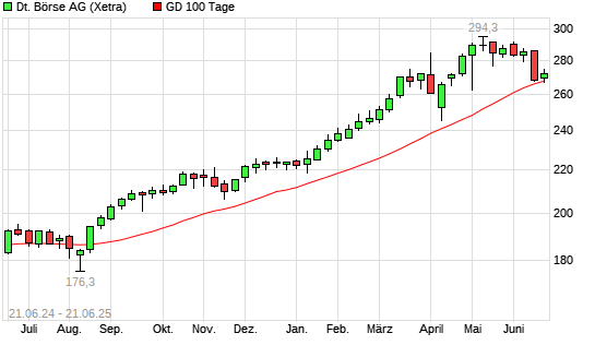 Mit dem Anstieg auf 272,90 EUR hat die Deutsche Börse-Aktie am 20.06.2025 die 100-Tage-Linie nach oben gekreuzt.