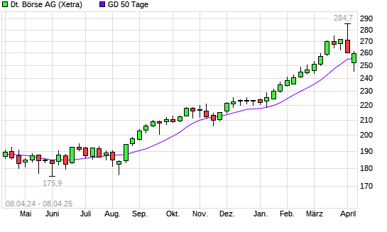 Mit dem Rücksetzer auf 248,90 EUR hat die Deutsche Börse-Aktie am 07.04.2025 die 50-Tage-Linie nach unten gekreuzt.