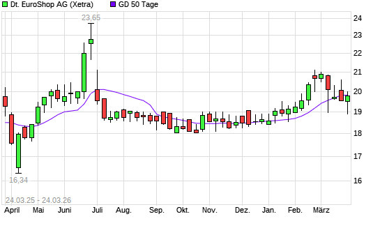 Mit dem Rücksetzer auf 19,48 EUR hat die Deutsche EuroShop-Aktie am 23.03.2026 die 50-Tage-Linie nach unten gekreuzt.