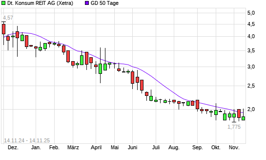 Mit dem Rücksetzer auf 1,84 EUR hat die Deutsche Konsum REIT-Aktie am 13.11.2025 die 50-Tage-Linie nach unten gekreuzt.