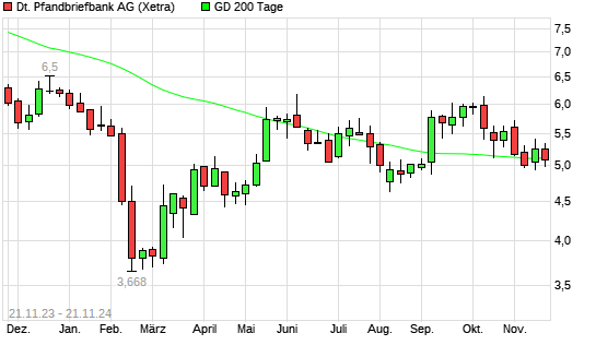 Mit dem Rücksetzer auf 5,05 EUR hat die Deutsche Pfandbriefbank-Aktie am 20.11.2024 die 200-Tage-Linie nach unten gekreuzt.