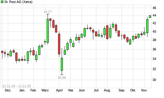 Mit dem Anstieg auf 43,98 EUR hat die Deutsche Post DHL-Aktie (ISIN DE0005552004) am 10.11.2025 ein neues 12-Monats-Hoch erreicht und damit den Kurs vom 06.03.2025 eingestellt.