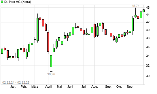 Mit dem Anstieg auf 45,39 EUR hat die Deutsche Post DHL-Aktie (ISIN DE0005552004) am 01.12.2025 ein neues 12-Monats-Hoch erreicht und damit den Kurs vom 28.11.2025 eingestellt.