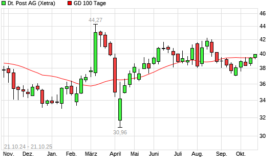 Mit dem Anstieg auf 39,88 EUR hat die Deutsche Post DHL-Aktie am 20.10.2025 die 100-Tage-Linie nach oben gekreuzt.