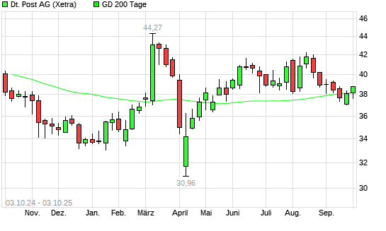 Mit dem Anstieg auf 38,70 EUR hat die Deutsche Post DHL-Aktie am 02.10.2025 die 200-Tage-Linie nach oben gekreuzt.