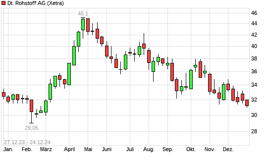 Mit dem Rücksetzer auf 31,00 EUR hat die Deutsche Rohstoff-Aktie (ISIN DE000A0XYG76) am 23.12.2024 ein neues 6-Monats-Tief erreicht und damit den Kurs vom 15.11.2024 eingestellt.