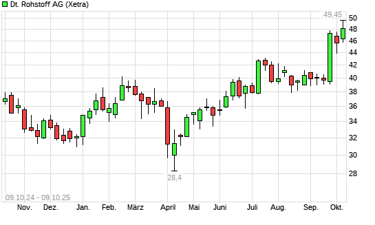 Mit dem Anstieg auf 48,75 EUR hat die Deutsche Rohstoff-Aktie (ISIN DE000A0XYG76) am 08.10.2025 ein neues All-Time-High erreicht und damit den Kurs vom 07.10.2025 eingestellt.