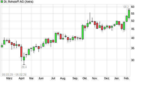 Mit dem Anstieg auf 57,40 EUR hat die Deutsche Rohstoff-Aktie (ISIN DE000A0XYG76) am 04.02.2026 ein neues All-Time-High erreicht und damit den Kurs vom 15.10.2025 eingestellt.