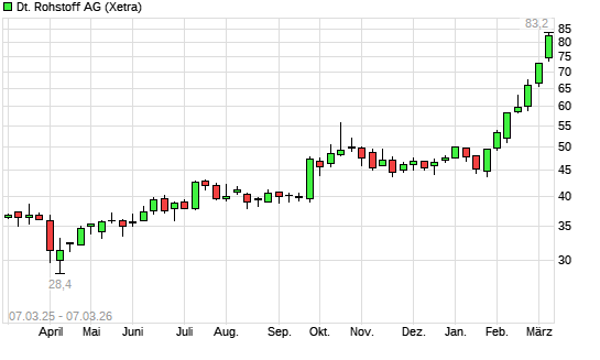Mit dem Anstieg auf 82,30 EUR hat die Deutsche Rohstoff-Aktie (ISIN DE000A0XYG76) am 06.03.2026 ein neues All-Time-High erreicht und damit den Kurs vom 05.03.2026 eingestellt.
