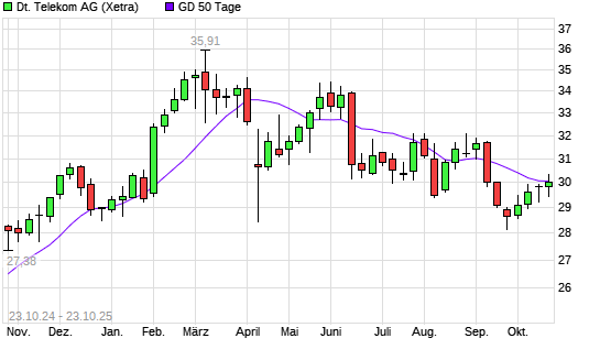 Mit dem Rücksetzer auf 30,02 EUR hat die Deutsche Telekom-Aktie am 22.10.2025 die 50-Tage-Linie nach unten gekreuzt.