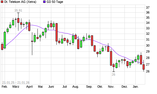 Mit dem Rücksetzer auf 26,77 EUR hat die Deutsche Telekom-Aktie am 20.01.2026 die 50-Tage-Linie nach unten gekreuzt.