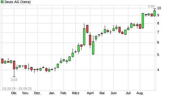 Mit dem Anstieg auf 9,52 EUR hat die Deutz-Aktie (ISIN DE0006305006) am 02.09.2025 ein neues 10-Jahres-Hoch erreicht und damit den Kurs vom 22.08.2025 eingestellt.