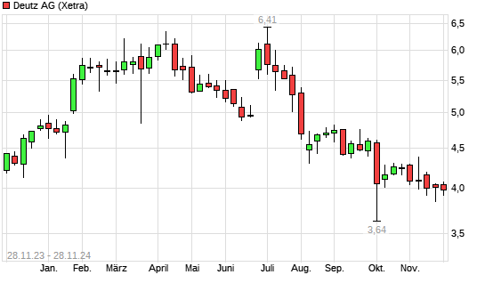 Mit dem Rücksetzer auf 3,96 EUR hat die Deutz-Aktie (ISIN DE0006305006) am 27.11.2024 ein neues 12-Monats-Tief erreicht und damit den Kurs vom 20.11.2024 eingestellt.