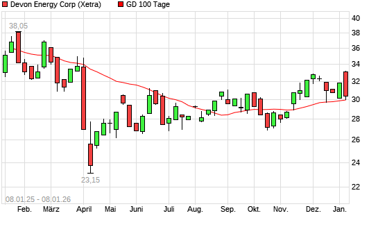 Mit dem Rücksetzer auf 29,65 EUR hat die Devon Energy-Aktie am 07.01.2026 die 100-Tage-Linie nach unten gekreuzt.