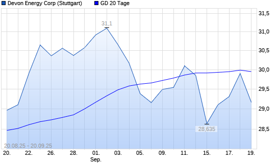 Mit dem Rücksetzer auf 29,83 EUR hat die Devon Energy-Aktie am 19.09.2025 die 20-Tage-Linie nach unten gekreuzt.