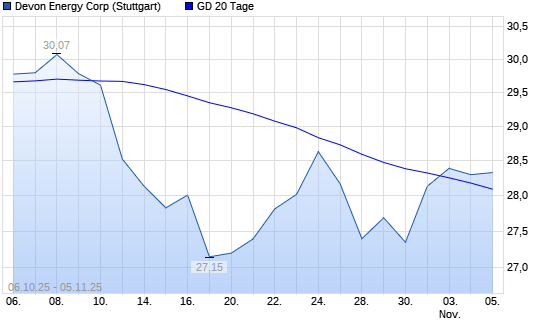 Mit dem Rücksetzer auf 28,00 EUR hat die Devon Energy-Aktie am 04.11.2025 die 20-Tage-Linie nach unten gekreuzt.