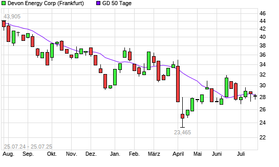 Mit dem Rücksetzer auf 28,13 EUR hat die Devon Energy-Aktie am 24.07.2025 die 50-Tage-Linie nach unten gekreuzt.