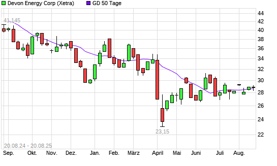 Mit dem Rücksetzer auf 28,52 EUR hat die Devon Energy-Aktie am 19.08.2025 die 50-Tage-Linie nach unten gekreuzt.