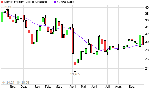 Mit dem Rücksetzer auf 29,32 EUR hat die Devon Energy-Aktie am 03.10.2025 die 50-Tage-Linie nach unten gekreuzt.