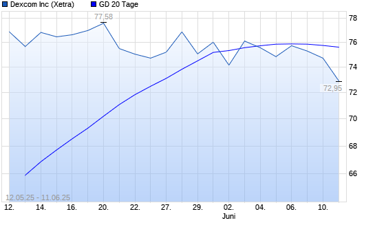 Mit dem Rücksetzer auf 74,66 EUR hat die Dexcom-Aktie am 10.06.2025 die 20-Tage-Linie nach unten gekreuzt.