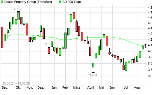 Mit dem Anstieg auf 4,12 EUR hat die Dexus Property Group-Aktie am 22.08.2025 die 200-Tage-Linie nach oben gekreuzt.