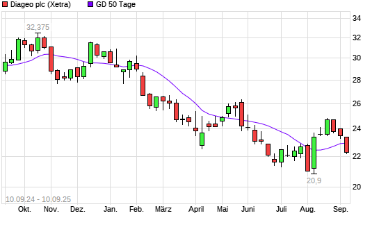 Mit dem Rücksetzer auf 22,70 EUR hat die Diageo-Aktie am 09.09.2025 die 50-Tage-Linie nach unten gekreuzt.