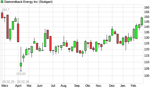 Mit dem Anstieg auf 147,12 EUR hat die Diamondback Energy-Aktie (ISIN US25278X1090) am 19.02.2026 ein neues 6-Monats-Hoch erreicht und damit den Kurs vom 04.02.2026 eingestellt.