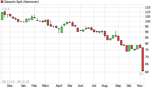 Mit dem Rücksetzer auf 71,00 EUR hat die Diasorin-Aktie (ISIN IT0003492391) am 05.11.2025 ein neues 5-Jahres-Tief erreicht und damit den Kurs vom 17.10.2025 eingestellt.