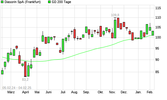 Mit dem Rücksetzer auf 101,05 EUR hat die Diasorin-Aktie am 03.02.2025 die 200-Tage-Linie nach unten gekreuzt.
