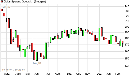 Mit dem Rücksetzer auf 164,42 EUR hat die Dick's Sporting Goods-Aktie (ISIN US2533931026) am 11.02.2026 ein neues 6-Monats-Tief erreicht und damit den Kurs vom 02.01.2026 eingestellt.Die ...weiterlesen