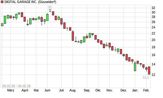 Mit dem Rücksetzer auf 12,20 EUR hat die Digital Garage-Aktie (ISIN JP3549070005) am 04.02.2026 ein neues 10-Jahres-Tief erreicht und damit den Kurs vom 12.02.2016 eingestellt.